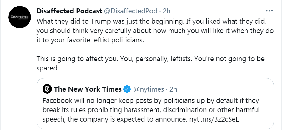 That could be true, but it’s far from necessarily true. It’s pattern-detection, but there’s more than one pattern here. The pattern could be: “I know, let’s just silence everything we dislike.” But it could also be: “This guy actually incited a riot that got people killed and came way too close to a literal successful insurrection so we really need to stop giving him this particular channel.” If it’s “everything we dislike” then yes, we’re all vulnerable, but if it’s “he’s an ex-president who incited what almost became an insurrection” then we’re not. Patterns are important, but so are particulars.