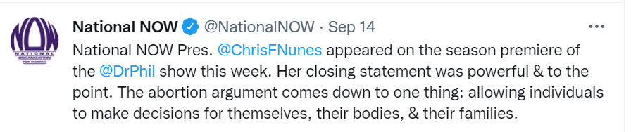 NOW is fully captured, just like the ACLU and Planned Parenthood and the National Women’s Law Center. Nothing for women any more, always people. Women don’t matter any more; nobody campaigns or proselytizes for women any more; women are so much chaff.