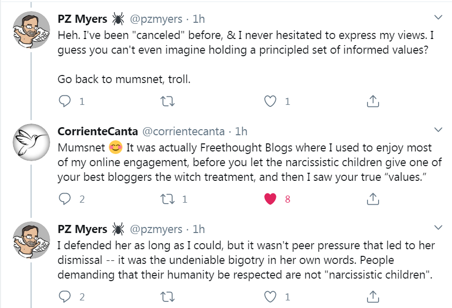 At the risk of boorishness, the above is an allusion to PZ’s handling of the Tuvel affair, where his only word on the matter was that using the term ‘witch hunt’ to describe it wasn’t fair because witches in Africa. Yes, he really is that big of a coward. It appears he hasn’t grown any braver since.