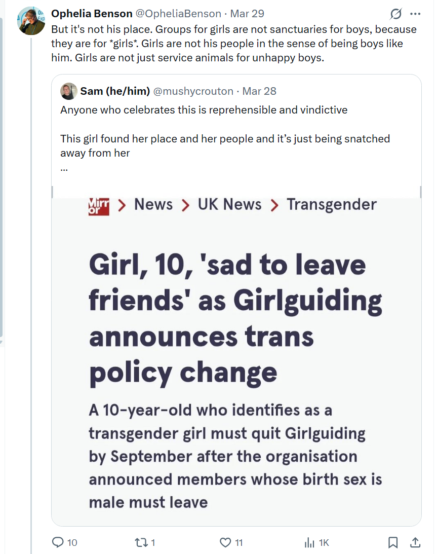 I didn’t bother to say we don’t “celebrate” the kid’s unhappiness, because of course we don’t; that’s just typical hyperbole plus assumption. I simply underlined for the billionth time that things for girls are for girls. A 10-year-old who identifies as a transgender girl is a boy. (I wonder if that subhead is even accurate. Does the boy really idennify as a transgender girl as opposed to as a girl? Or did the Mirror just put it that way in an attempt to clarify the usual murk?)