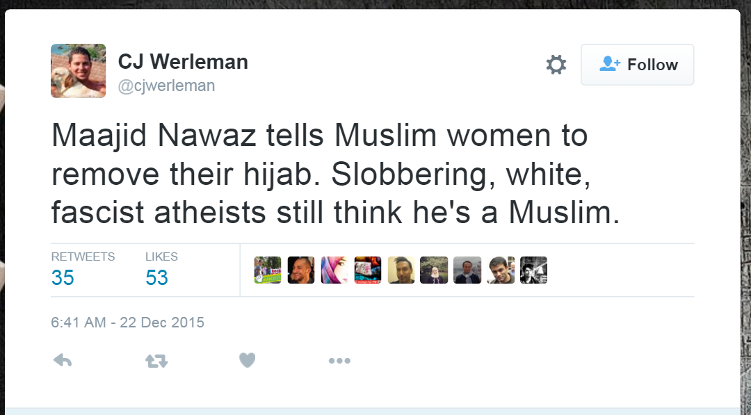 Werleman is a total piece of shit who loves to attack liberal Muslims like Nawaz as “native informants” and “not true Muslims”. It’s amazing cheek as well repugnant.