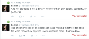 This doesn’t mean I am always 100% perfect in my treatment of trans people. I don’t always understand why some situation would be problematic, but if I am told I try to accommodate, even if I still don’t understand. I am willing to accept that it matters. If Sabine is going to call people oppressors for existing, or for being a majority, then she is being counterproductive.