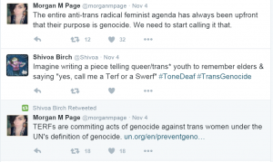 Yes, it would seem that few if any radical feminists have ever beaten or killed a trans gendered women. And what a mockery these people are making of the term ‘genocide’.