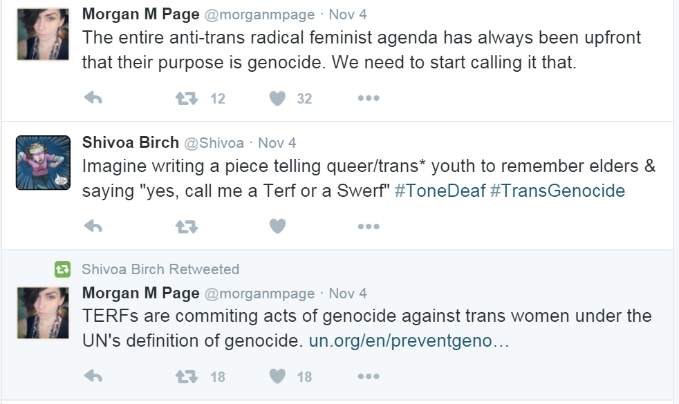 The entire anti-trans radical feminist agenda has always been upfront that their purpose is genocide. We need to start calling it that.