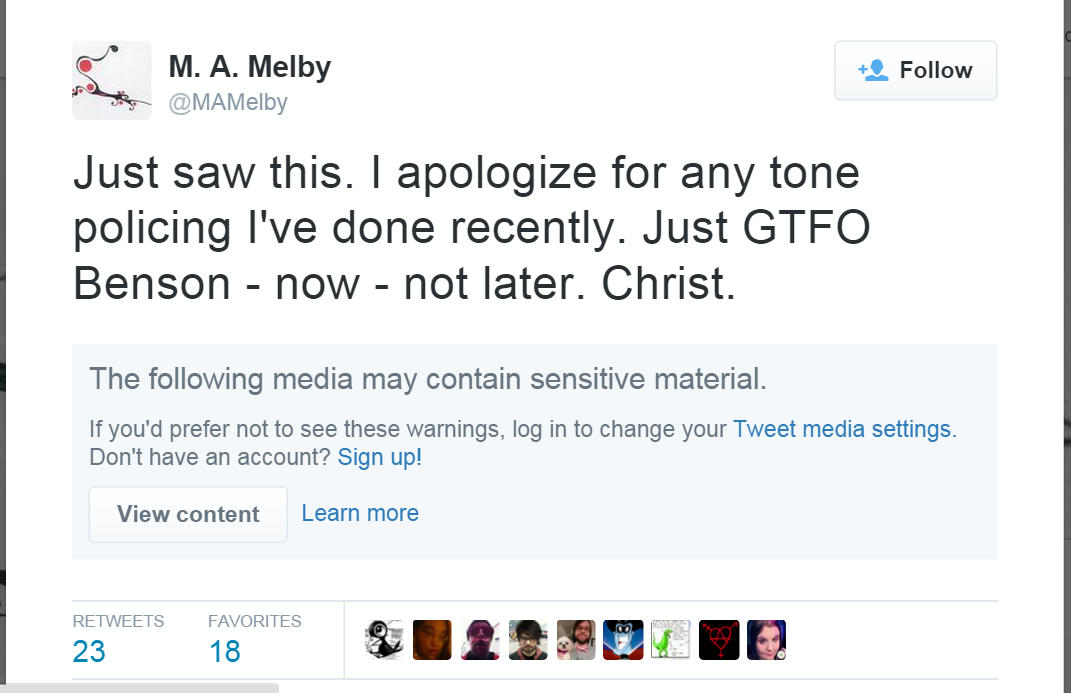 Just saw this. I apologize for any tone policing I’ve done recently. Just GTFO Benson – now – not later. Christ.