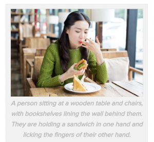 They describe an image of a skinny dainty young woman with “a person” and “they”…thus leaving the people unable to see images in ignorance of what sex the person holding a sandwich is.