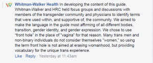 Whitman-Walker Health posted on Facebook about its “Safer Sex for Trans Bodies” guide, the one that says women have front holes while trans women have vaginas. A woman commented to say it’s misogynistic to call vaginas front holes.
