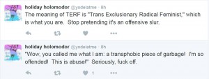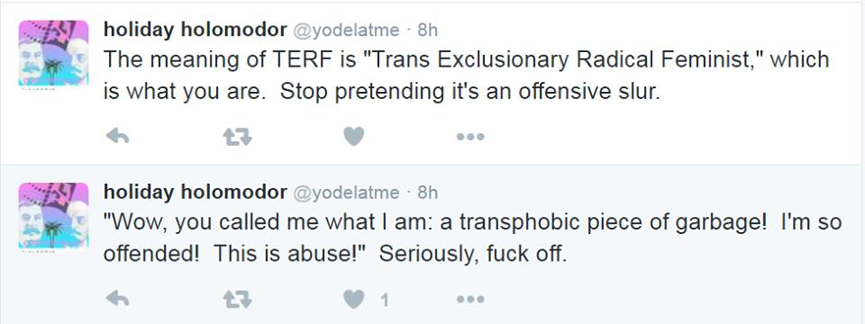 Perfect, isn’t it? First tweet: how dare you pretend TERF is an offensive slur. Second tweet: you are a transphobic piece of garbage.