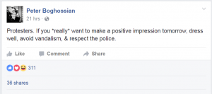 I’m going to guess that Boghossian is more concerned about protesters avoiding vandalism than dressing nicely. Putting the two together was probably meant for jovial effect– a failure, if so.