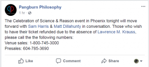 The Celebration of Science & Reason event in Phoenix tonight will move forward with Sam Harris & Matt Dillahunty in conversation. Those who wish to have their ticket refunded due to the absence of Lawrence M. Krauss, please call the the following numbers: