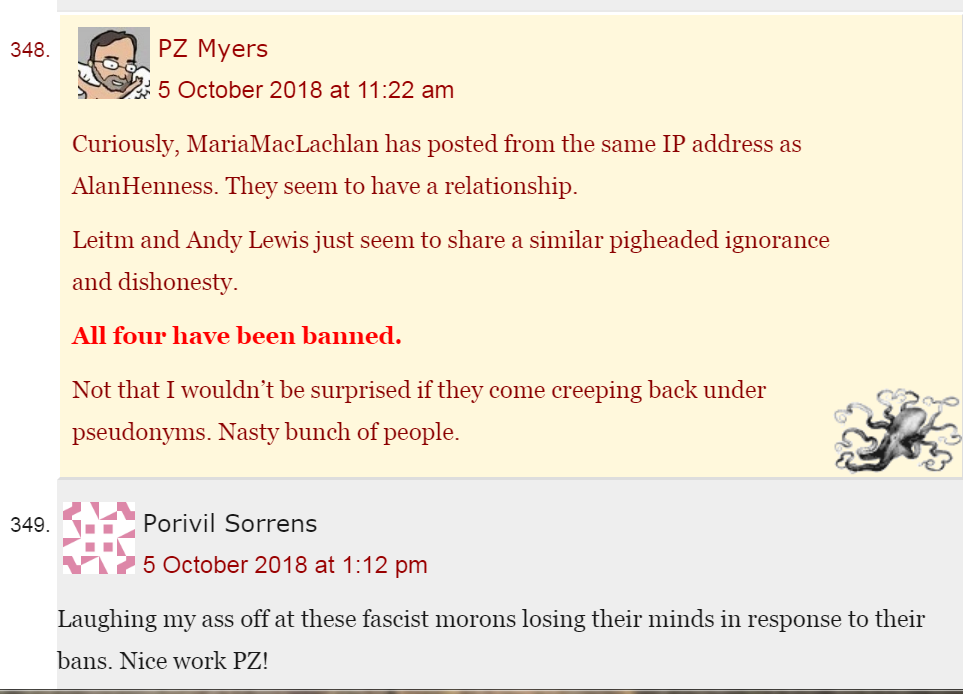 “Porivil Sorrens” is so mindless and abusive that I wonder if it’s an extended trolling…but I don’t have the inclination to spend more time reading Pharyngula to try to get more evidence.