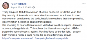 Tracy Single is 15th trans woman of colour murdered in US this year. The tiny minority of feminists who demonise trans women as a threat to non-trans women contribute to the toxic, hateful atmosphere that fuels prejudice, discrimination & violence against trans people.