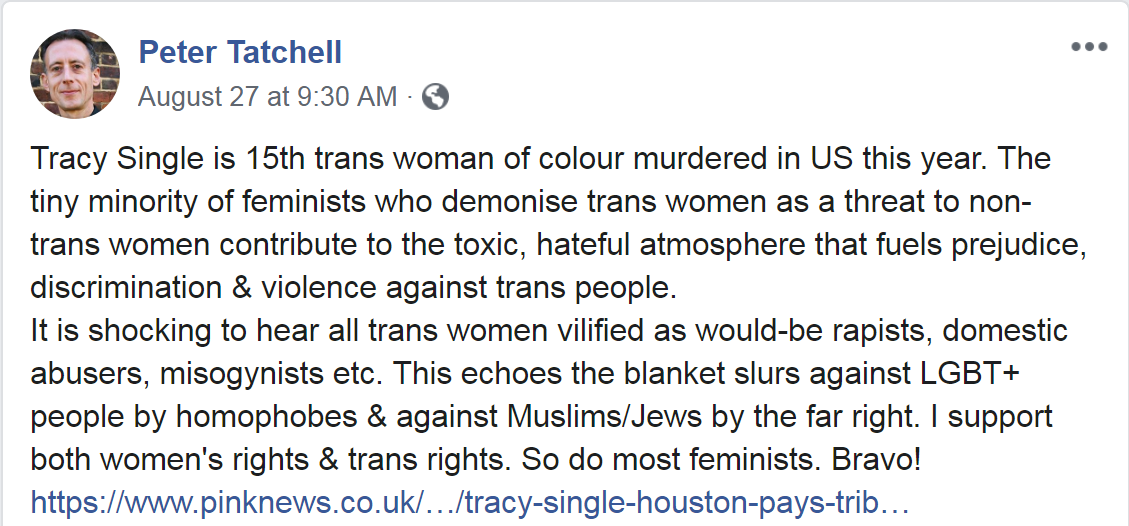 A black man is murdered, and somehow that’s not an occasion for condemnation of racist violence but instead for an angry rant about women who don’t agree that men are women if they say so. A black man is murdered so Peter Tatchell yells at women. Wtf???