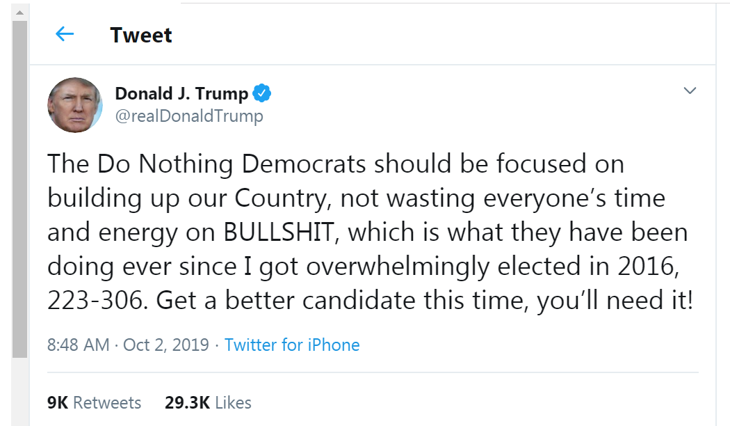 The Do Nothing Democrats should be focused on building up our Country, not wasting everyone’s time and energy on BULLSHIT, which is what they have been doing ever since I got overwhelmingly elected in 2016, 223-306. Get a better candidate this time, you’ll need it!