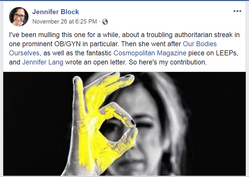 I’ve been mulling this one for a while, about a troubling authoritarian streak in one prominent OB/GYN in particular. Then she went after Our Bodies Ourselves, as well as the fantastic Cosmopolitan Magazine piece on LEEPs, and Jennifer Lang wrote an open letter. So here’s my contribution.