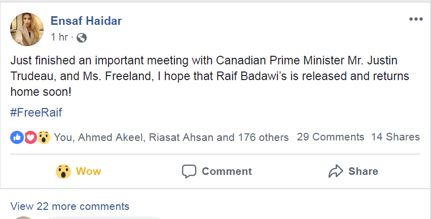 Just finished an important meeting with Canadian Prime Minister Mr. @JustinTrudeau, and Ms. @cafreeland, I hope that @raif_badawi is released and returns home soon!#FreeRaif