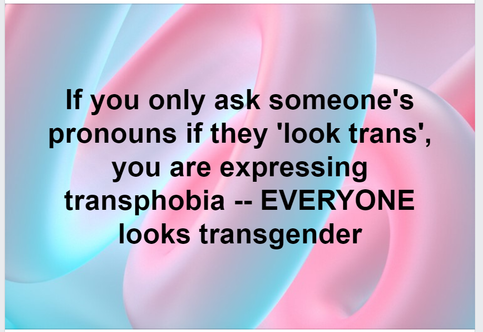 If you only ask someone’s pronouns if they ‘look trans’, you are expressing transphobia – EVERYONE looks transgender.