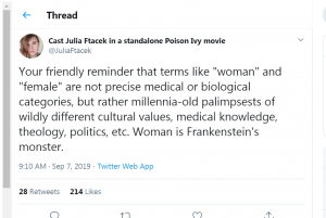 PZ seems to have no concept that his idea of gender fluidity actually argues against trans dogma. Gender fluidity is what the rad fems are arguing for, not the placing of people into these boxes, moving them from one box to another, and creating whole new gender identities for the 99.9% of people who do not fit precisely into one box or the other. Break the back of the stereotypes, and trans people could feel at home in whatever sex they are born, because their sex would not come with a predefined set of behaviors they are expected to follow. Everyone could play with the fun toys (however they define that); everyone could wear the fun clothes (however they define that); everyone could have whatever name they preferred; everyone could just be themselves…and we could still segregate sports and women’s shelters on the basis of sex, recognizing certain biological realities that are currently being ignored.