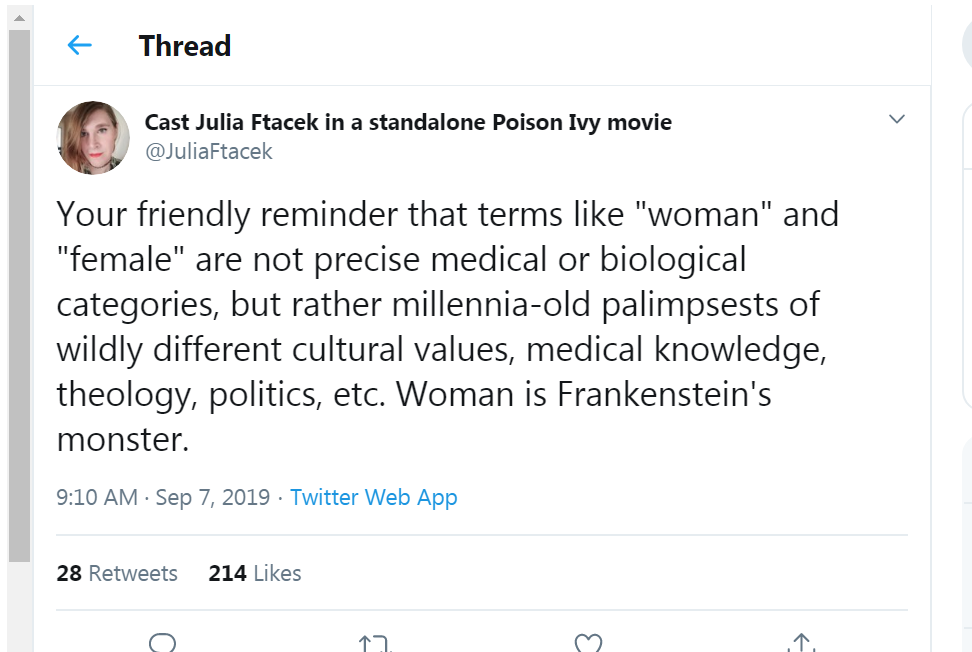 What the TRAs refuse to admit is, when they say things like this (meaningless as they are), they are effectively saying if you don’t fit all the stereotypes, you are either gender neutral, non-binary, or genderqueer. So what makes her genderqueer when there are other women (such as myself) who do not fit the stereotype precisely, but do have some characteristics that fit the traditional female stereotype? Such as, I like math, but not sports. I like sweet wine and vegetables, but I don’t have a nurturing nature. I like wearing earrings but not make up. And so on, and so on…So, either I am genderqueer, non-binary, gender neutral, or some other bafflegab word, or it isn’t the case that liking things from both ends of the gender stereotype spectrum doesn’t mean anything about what gender you are. (Yes, only one data point. We could amass many.)