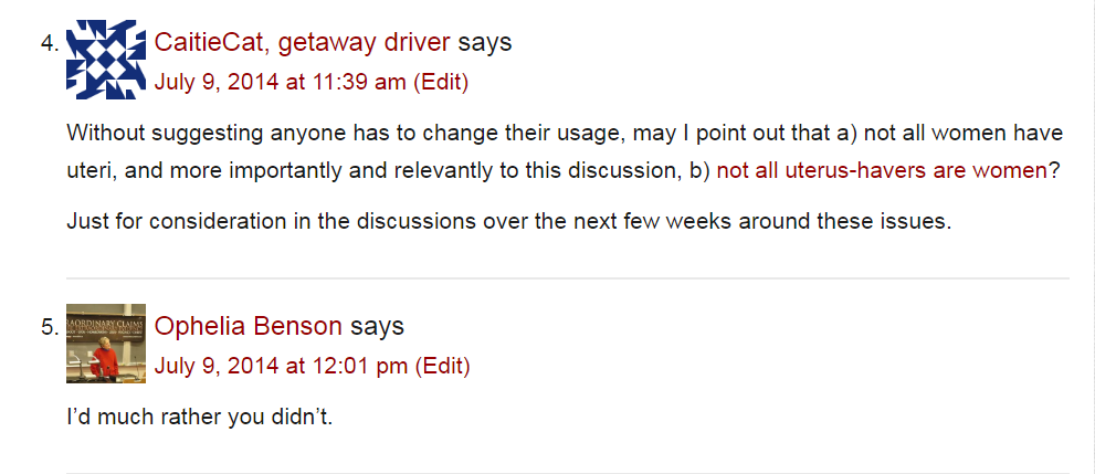 Like iknklast, The Unpleasantness and other roughly simultaneous events were what caused me to flip my attitude from “who am I to say they’re not women?” to “who are they to say they are?”