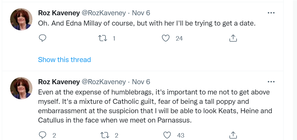 Stating a belief that he is a peer of Keats, Heine, and Catullus, and that he is the tall poppy others wish to cut down, while making a pretence at being modest enough to find that belief embarrassing, while aldo admitting that this entire thing is a knowing humblebrag. Such densely layered narcissism in a single tweet is a rare find.