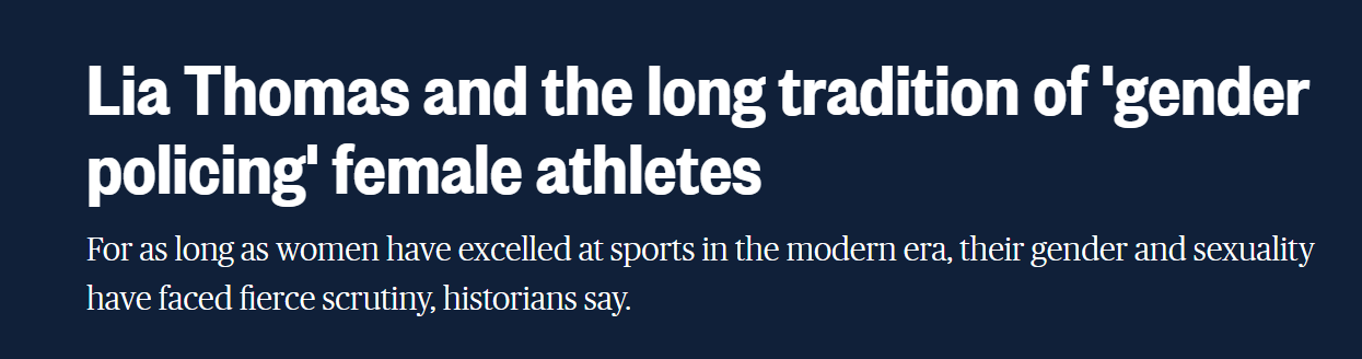 We’re told about Olympic runner Helen Stephens, who was framed as not girly enough in the 1930s. Definitely interesting, but nothing to do with Lia Thomas – the opposite of Lia Thomas.