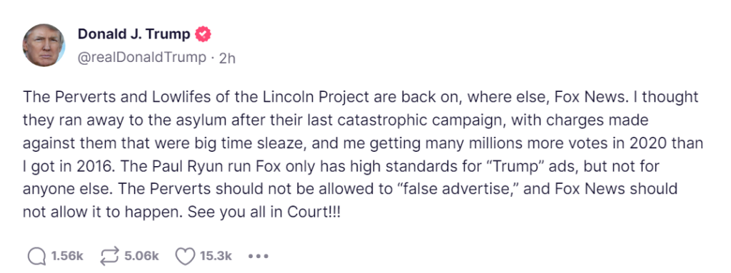 It would be hilarious if Trumpski really did try to take the Lincoln Project to court. First, he can’t get lawyers anymore because he never pays them. Second, the truth is an absolute defense against slander. Third, discovery would be a helluva show. The Lincoln Project could sell tickets.