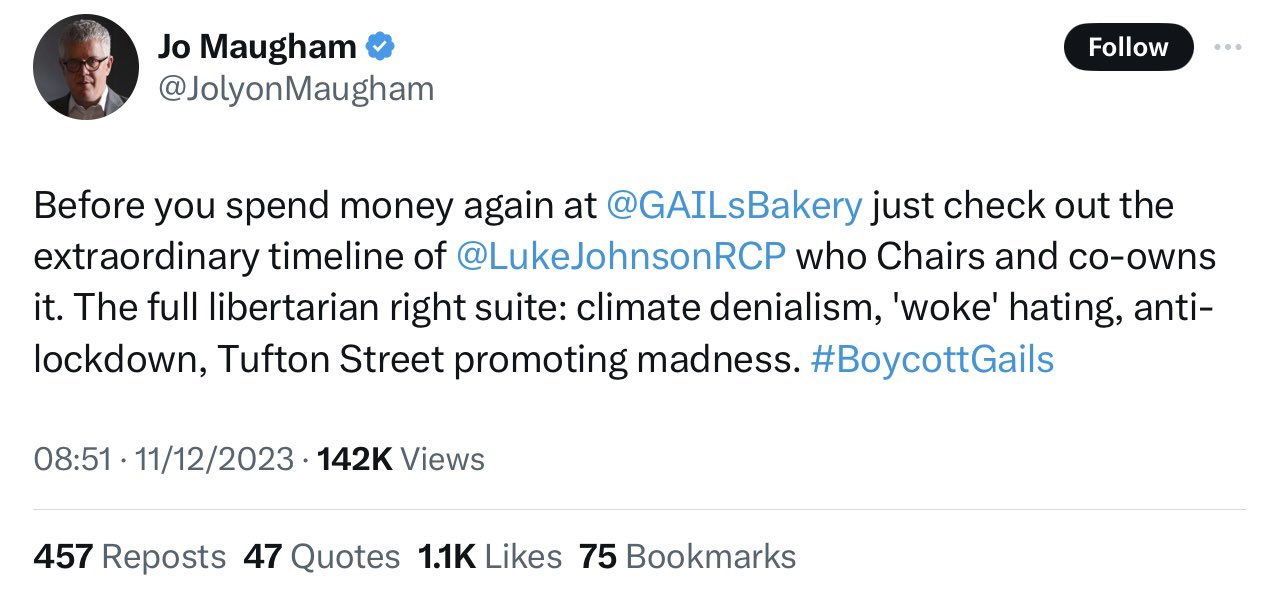 I suspect a great many companies are owned or run by people with opinions we may not like. Boycotts are called only when these views are revealed in public, even if the views have absolutely no impact on the running of the company. What did the bakery do wrong? What can the bakery possibly do to regain these customers? How will we know when the bakery is acceptable again? What about all the other bakeries, do we know the political views of their owners, and can we verify that their opinions are acceptable? How do we know that the bakery that picks up business as a result of this controversy is run by the right kind of people?