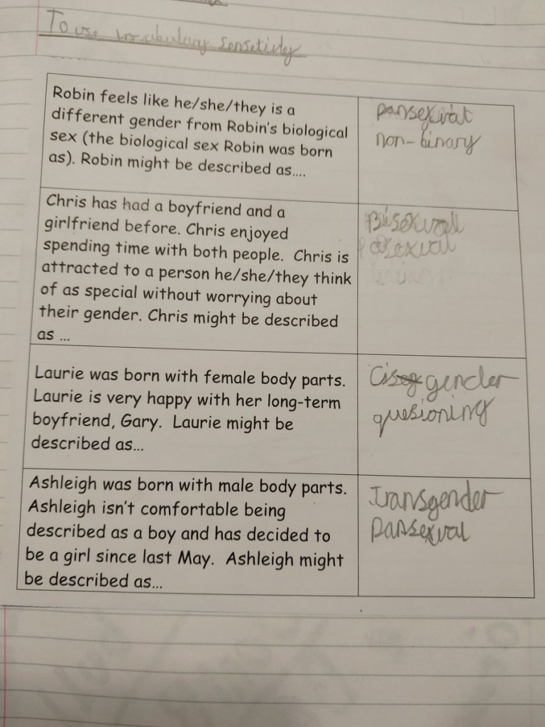 The first thing I notice isn’t even about the stupid destructive ideology being shoved at children who are too young to judge it critically. The first thing I notice is the fact that there are multiple clunky mistakes in the very first question. 1. “Robin feels like he etc is” – yuck. Robin feels that he is or Robin feels as if he is. This is school, not the pub. 2. …”like he/she/they is” – yo! If you’re gonna be teaching kids the New Progressive Whatsit, how about not taking it for granted that the “he” comes first? How about mixing it up a little? How about putting the “she” first? It’s so typical – here’s this cutting-edge new ideology, that retains all the old stupid sexist habits feminists have been pointing out for generations. 3. “he/she/they is” – insert eye-roll here.