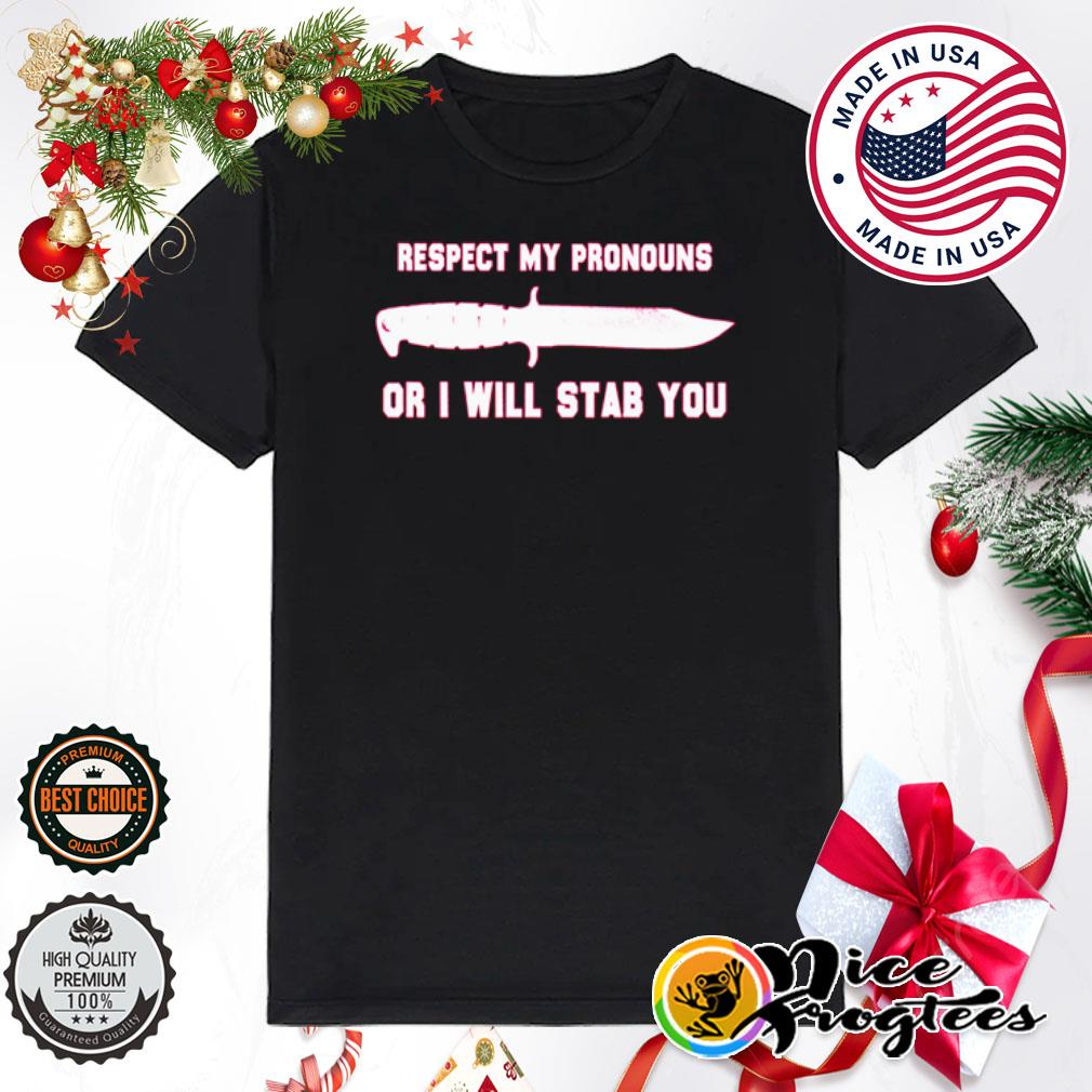 This is the newest Respect My Pronouns Or I Will Stab You Shirt, hoodie, sweater, tank top and long sleeve tee. These items are created by the design team of Nicefrogtees Store. It is the best gift for you, your friends and your family as well. This item is for men, women, kids, adults, from XS to 5XL. It is a limited edition product so you can buy it for yourself or your loved ones as a gift.