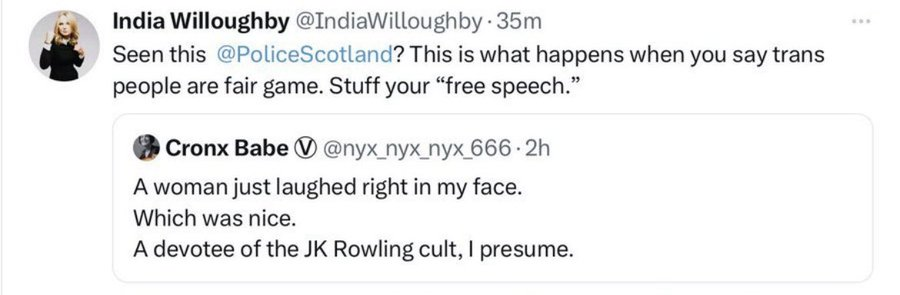 Saying women will not be arrested for stating biological facts does not equal saying trans are fair game. I suspect the police would act instantly if Rowling threatened a transwoman with a knife or gun, guillotined them, or burned them at the stake. Of course, all of those would be crimes without the hate crime law.