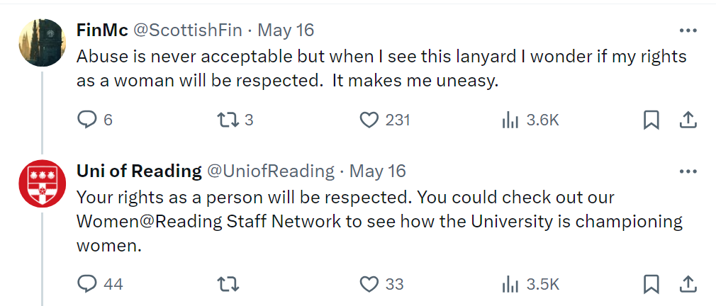 The University of Reading (or, perhaps, just its Twitter jockey) does not believe in women’s rights. Trans rights yes, of course, but women’s, no. If you want to talk about women’s rights you can’t, you have to call them people’s rights.