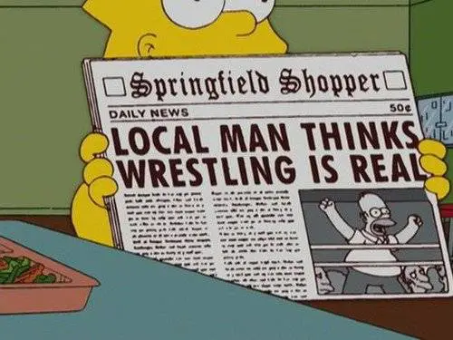As a kid, my rudimentary understanding of physics (which I’m sure most people have) told me that “professional wrestling” was choreographed and staged. I could tell that the punches were pulled (or thrown in parallel to the opponent’s body, rather than perpendicularly to it), and that the (over)reactions to those punches were voluntary, and in the wrong direction, not the result of real physical contact of the required magnitude. I could see that the throws and jumps and ropework were not an assault but a duet, that without prior planning, performing any of these moves would have resulted in actual, serious injury or death. Two men really fighting it out with those techniques would not look or sound like that at all, and the results would be maiming and or fatal. I was not captured at all by the spectacle or theatricality. I couldn’t be bothered with the characters or backstories. It was all just tawdry bullshit.