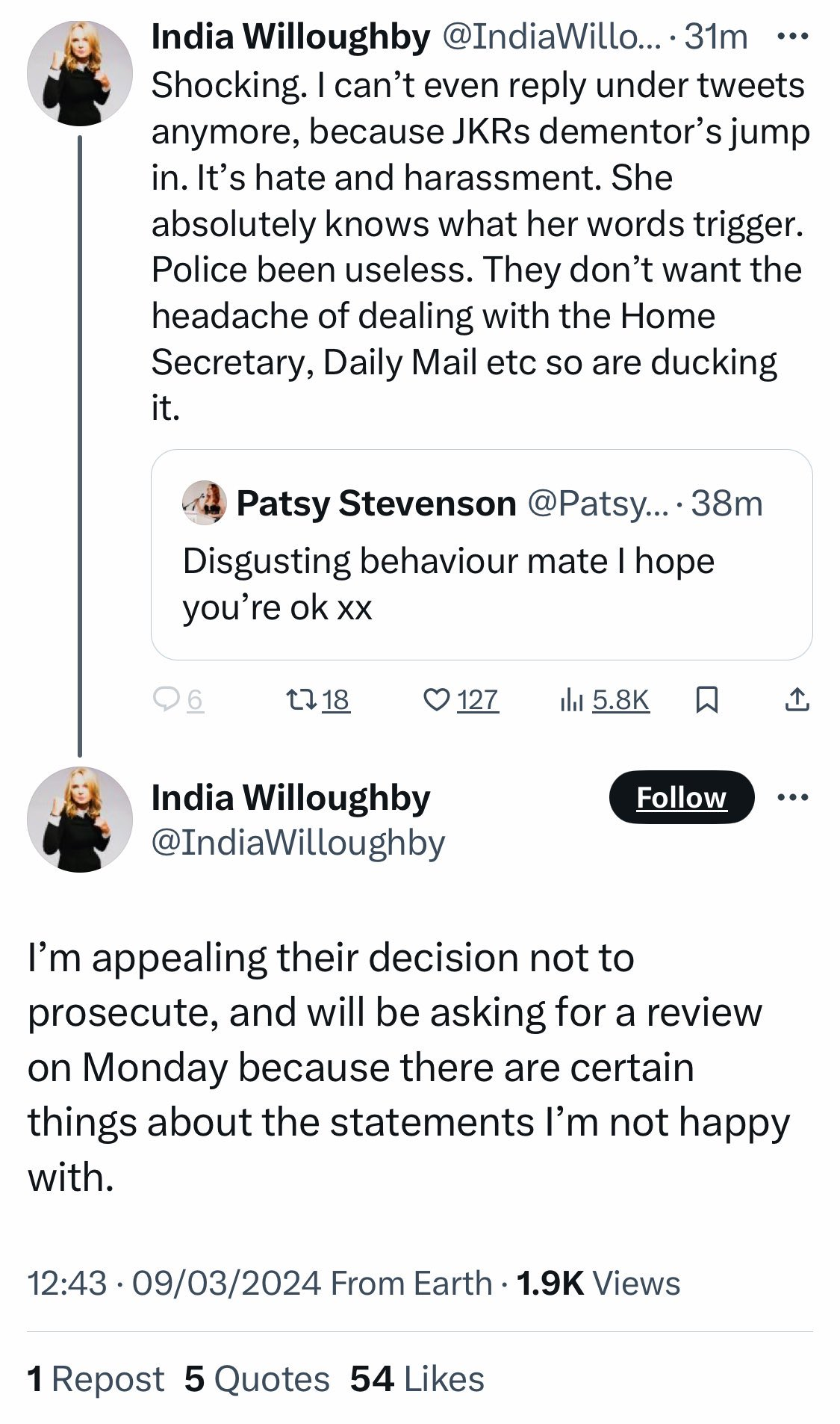 “India” Willoughby is trying to make a career for himself out of harassing JK Rowling. He’s hugely productive in the sense of churning out content, but he’s not very strategic or effective or even interesting.