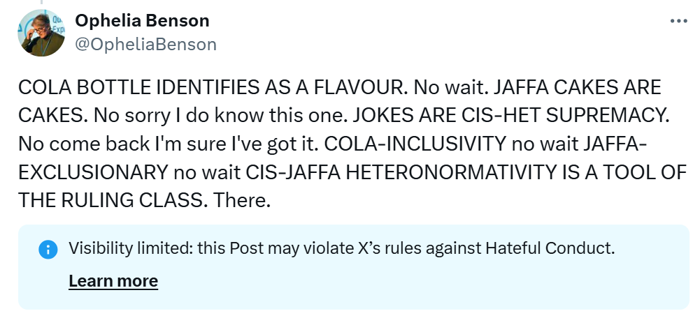 Your brain on gender identity ideology. Yep, this time I'm apparently right wing because *checks notes* I joked about a new flavour of Jaffa Cakes. pic.twitter.com/ITIjGRMIuI