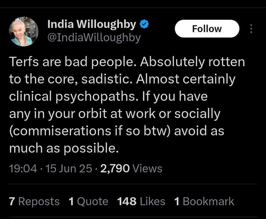 My orbit at work was almost entirely TERFs; I worked in the science department. Unfortunately, since retirement, I spend most of my time with the theatre crowd, and everyone is either trans-friendly or pretends to be trans-friendly.