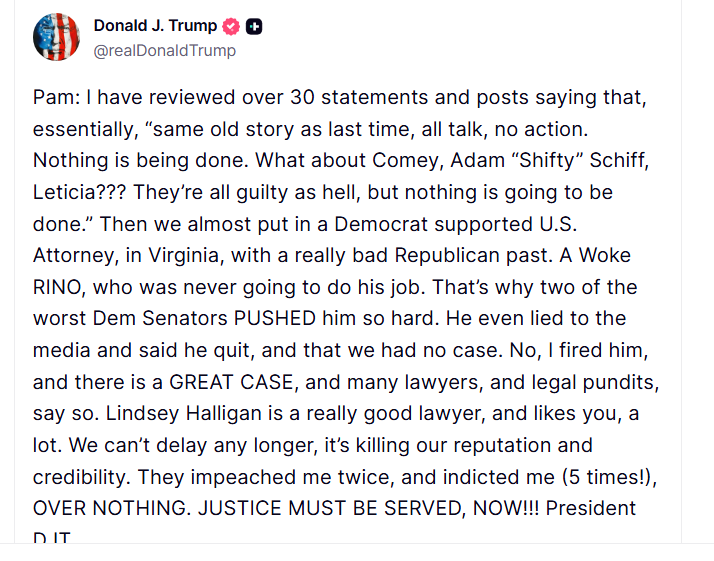 In his remarkable first post to social media Saturday, Trump essentially called on Bondi to use the power of the Justice Department more aggressively.