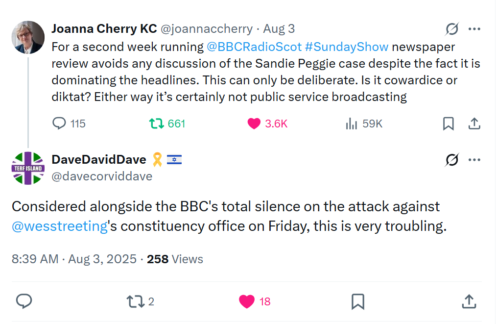 The BBC is as captured by genderists as the NHS. I view the lack of coverage of the Sandy Peggie case as a sign that the BBC thinks the case is not going well for Upton. Upton’s been credibly accused of fabricating his medical notes. And the labour tribunal already dismissed the case against Peggie for lack of evidence of wrongdoing.