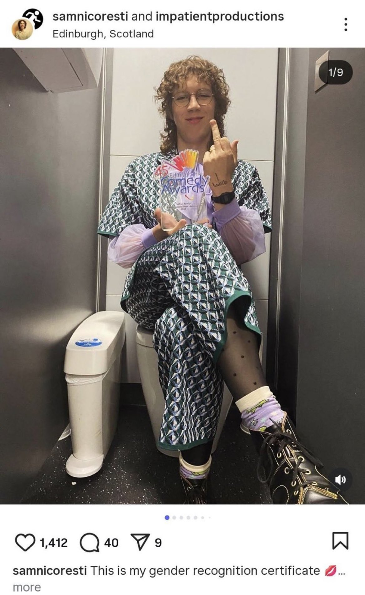 Here he is in the women’s toilet with his award.