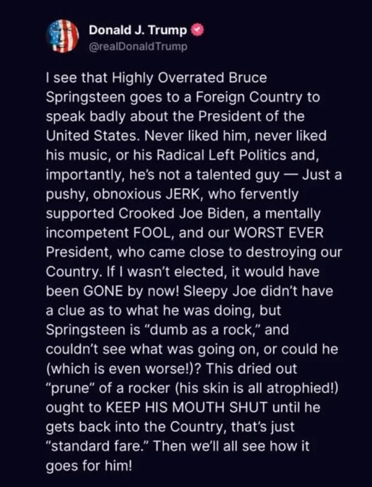 “to speak badly about” – he means slam or attack or bash or go after or even criticize. “Speak badly” means stutter or mumble or squeak or any other version of unskilled talking. It means doing the act of speaking in a bad, talentless way. It does not mean speaking of one too-powerful man in a way said man doesn’t like. This is in fact, tidily, an example of Trump…wait for it…speaking badly. He always speaks badly because he has a tiny vocabulary and he’s dumb as a stump. Springsteen, not so much.