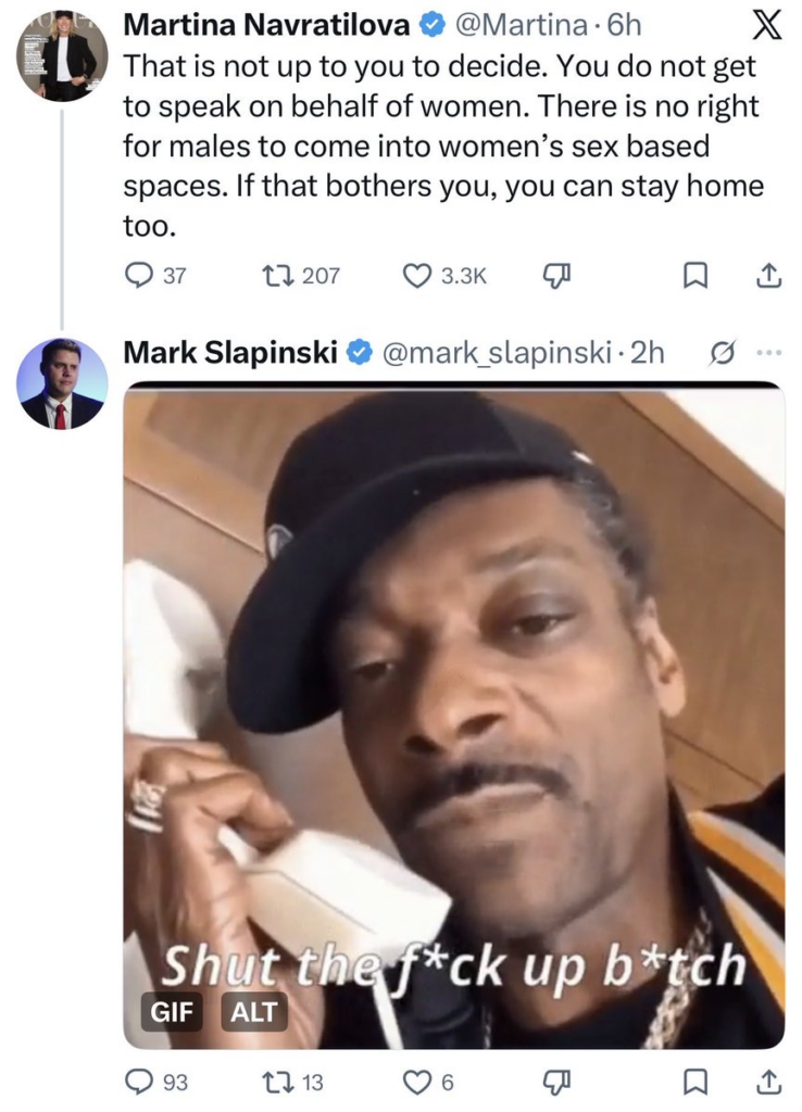 BREAKING: I successfully TRIGGERED transphobic former Tennis star @Martina Navratilova.She used to be the best tennis player in the world. Now she's a pathetic internet troll. pic.twitter.com/mfAXMJC4S2— Mark Slapinski (@mark_slapinski) April 19, 2026
